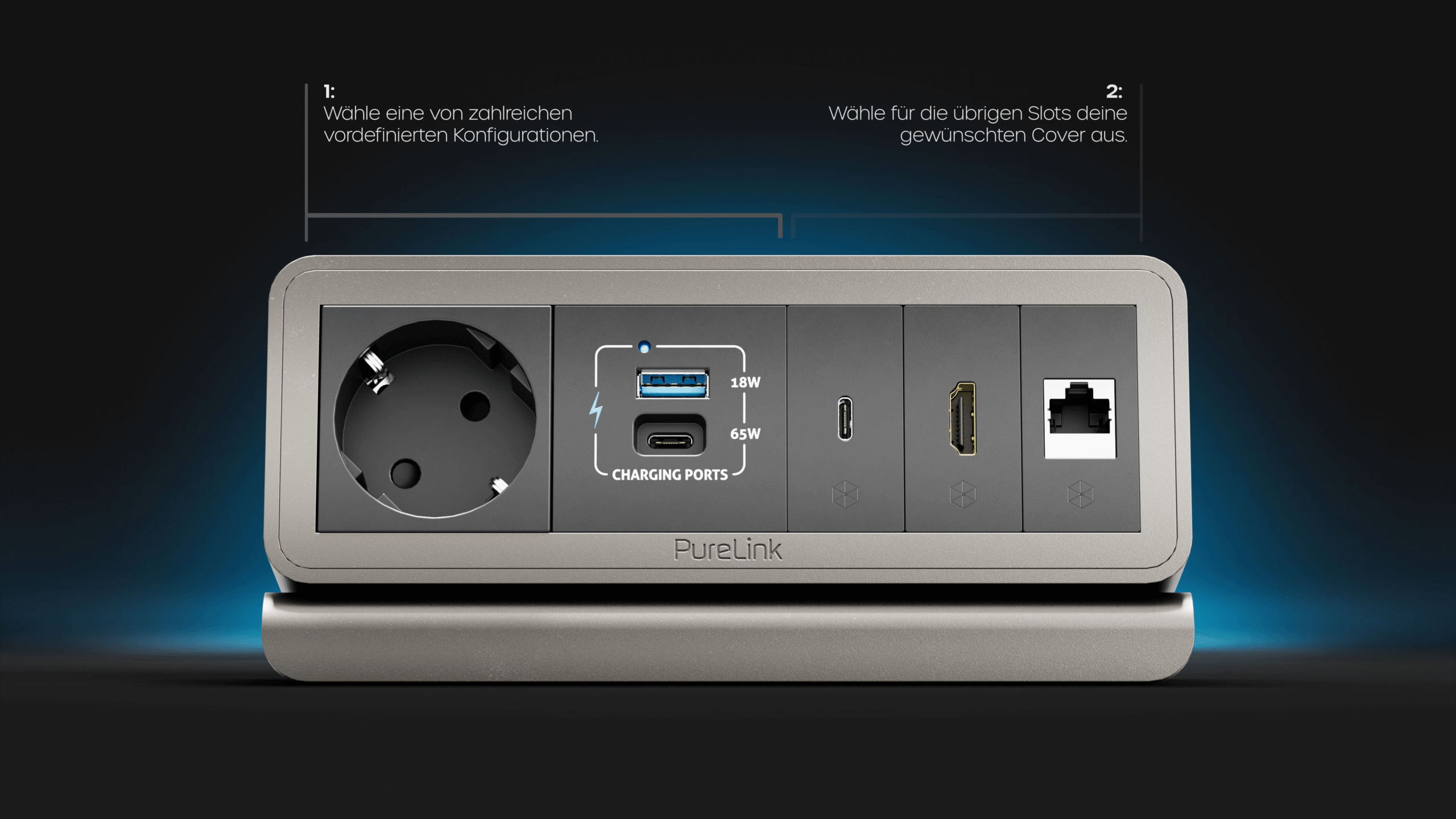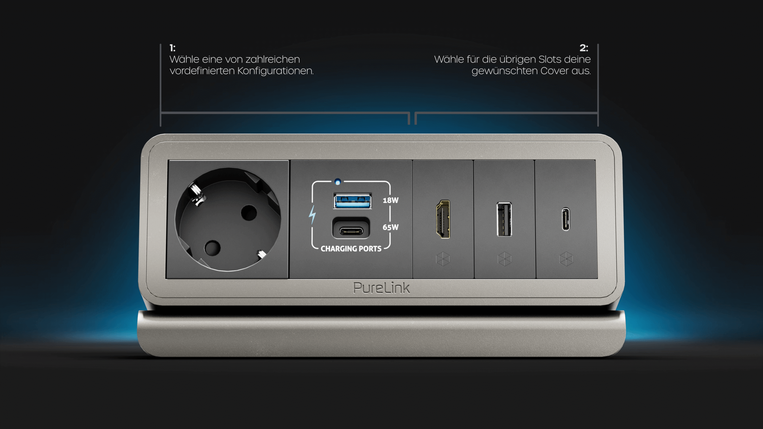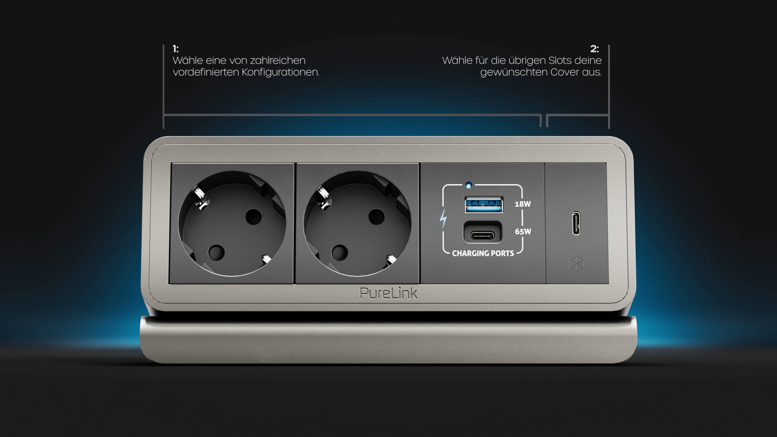 Zwei Steckdosen, 65W Power Delivery, USB-C, USB-A, USB, Keystone und HDMI –