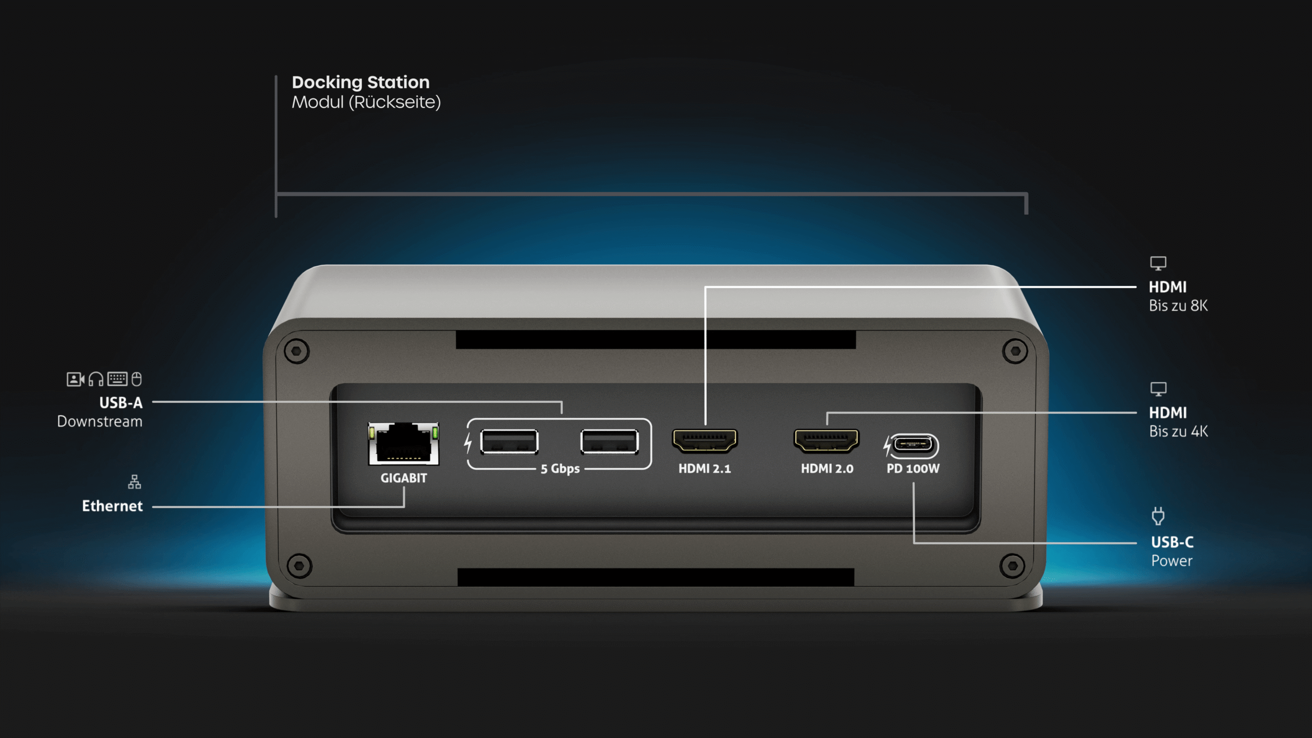 wie USB-C (100W Fast Charging), Dual HDMI, 3× USB 3.2 und Gigabit LAN