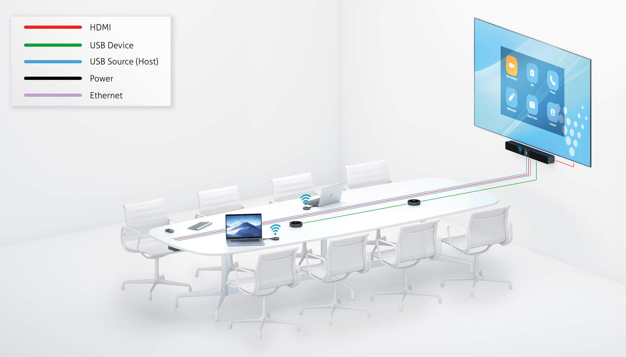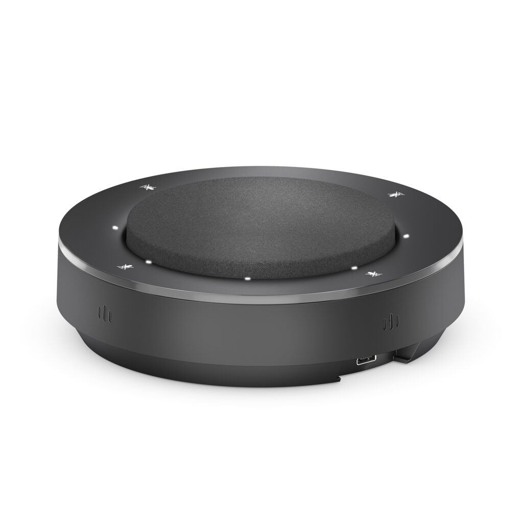 A premium video bar boasting a smart 4K camera, a 4 MEMS mic array, powerful stereo speakers. Integrated into this is a media switcher with inputs including, USB-C incl. 60W PD, HDMI + USB, and cross platform wireless connectivity.